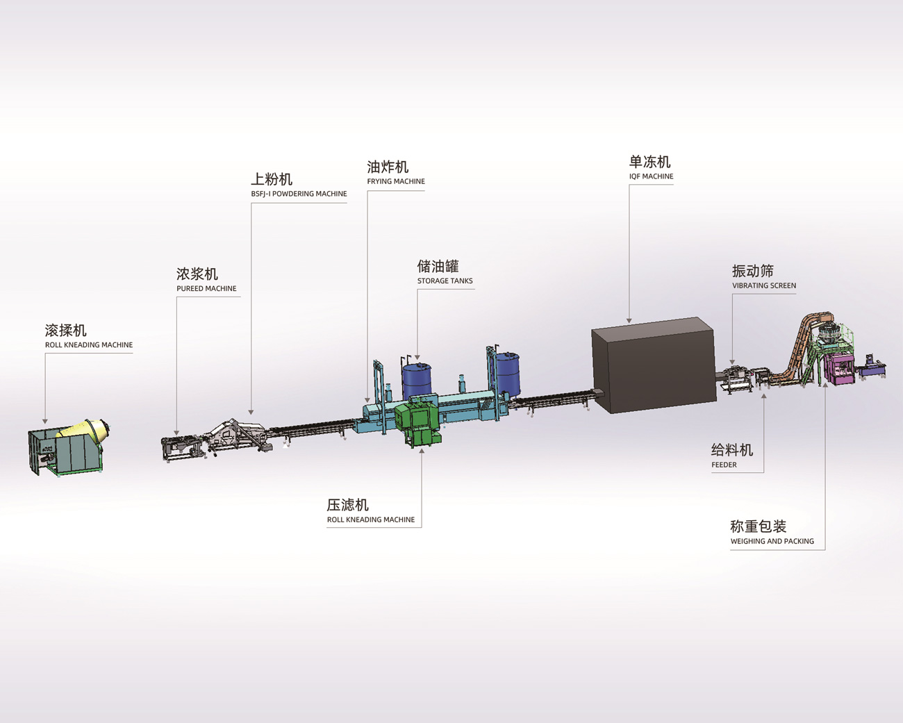 Tumbler, sizing machine, flour coating machine, continuous fryer, pressure oil filter equipped with weighing, packaging and check weighing equipment, suitable for all kinds of cooked food and prepared goods enterprises.